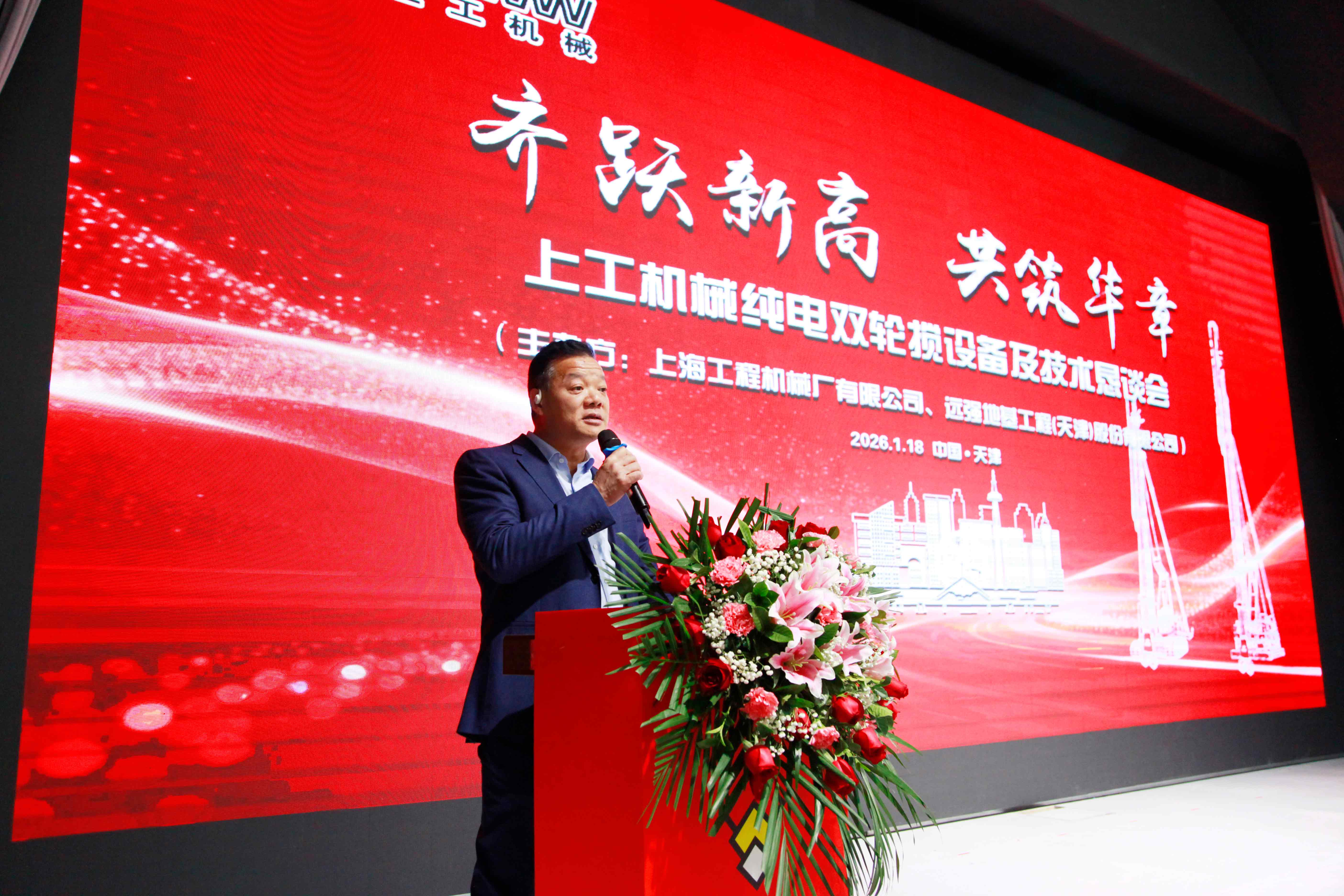 1月18日,由上海工程机械厂有限公司(以下简称“上工机械”)与远强地基工程(天津)股份有限公司(以下简称“远强地基”)联合主办的“上工机械纯电双轮搅设备及技术恳谈会”在天津玺瑞宴会艺术中心圆满召开。本次会议以“齐跃新高、共筑华章”为主题,汇聚了来自全国各地的双轮搅设备施工行业的企业领导、项目管理者及合作伙伴,共同围绕纯电双轮搅拌设备的创新技术、工程应用与发展前景进行了深入交流与展望。
