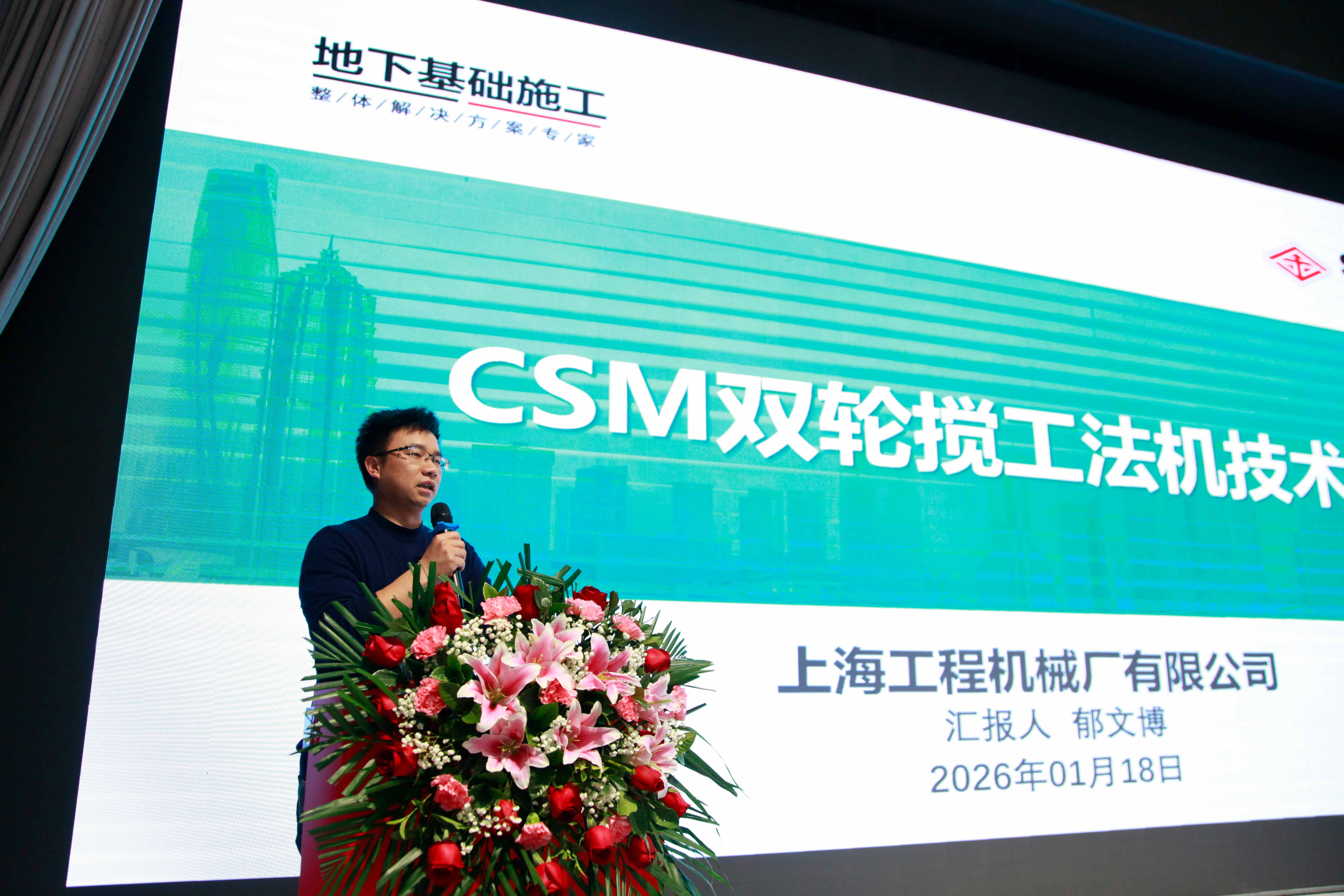 上工机械副总经理兼研发部部长郁文博做《CSM双轮搅工法机技术发展》主题报告。